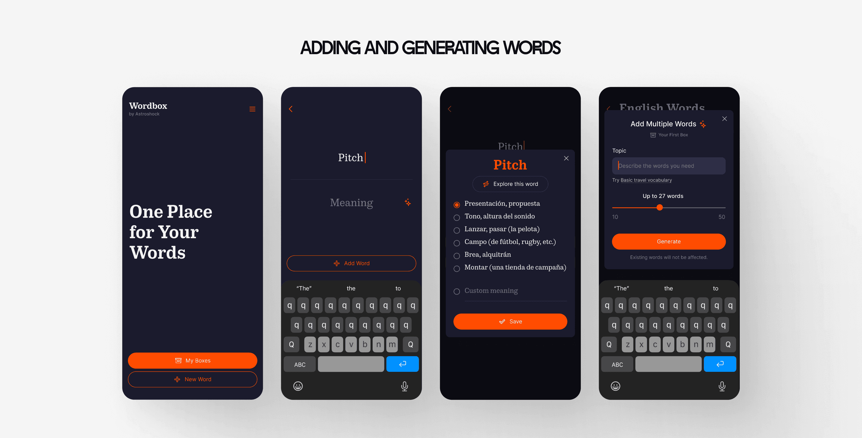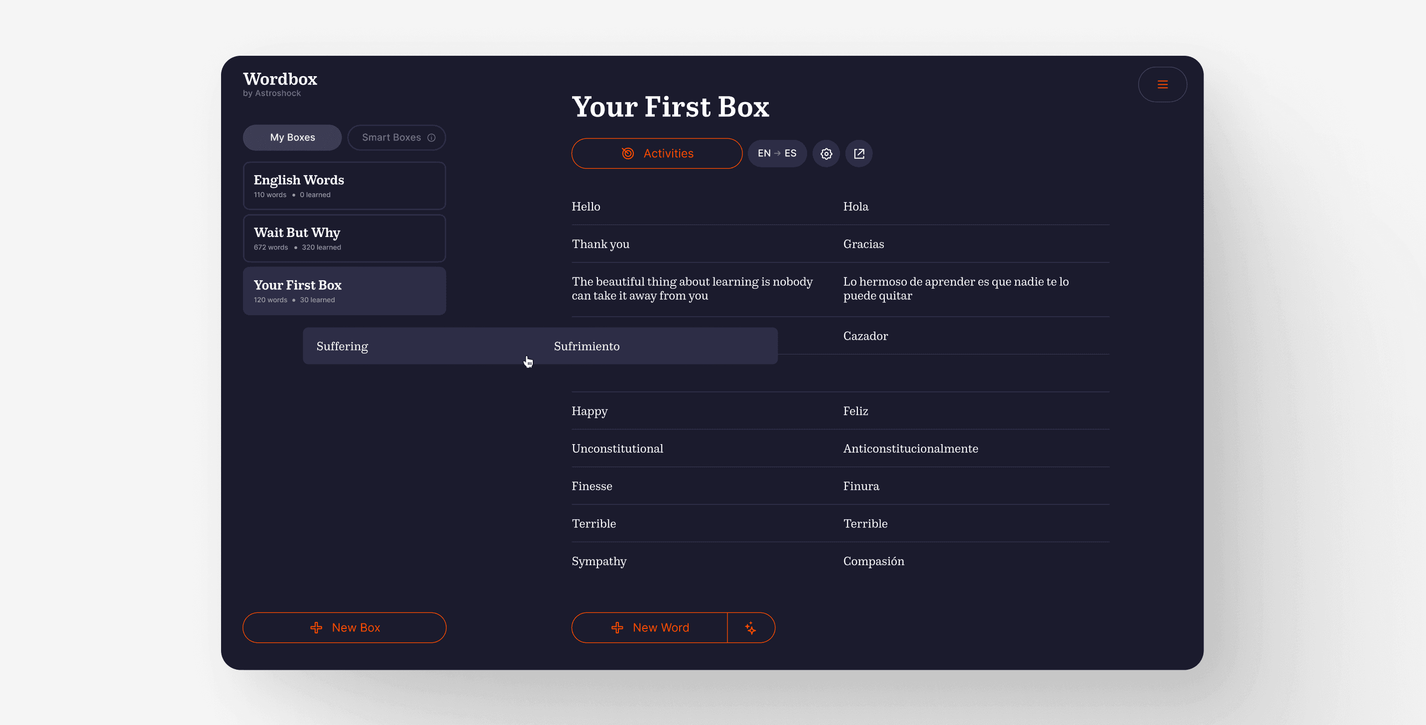 Wordbox is a cross-platform language learning app that helps users collect vocabulary, explore meanings in depth, and reinforce knowledge through AI-powered features and exercises.